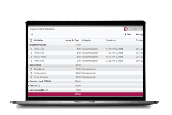 With our advanced attendance time comparison feature, compare actual worked hours against your company’s working time model.